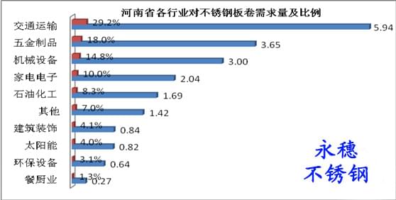 结合上面河南省各区域的统计数据,河南省不锈钢板卷主要应用于五大行业,需求量达16.32万吨,合计占比80.4%;三大重点行业需求量达12.59万吨,合计占比62.0%。数据反映河南省各市不锈钢消费结构虽然各有特色,但由于各地区差异化消费发展较为合理,使得整体上河南下游不锈钢消费结构较为均衡。从调研数据另一面也可以反映出河南省不锈钢需求结构稳定,市场风险较小。
